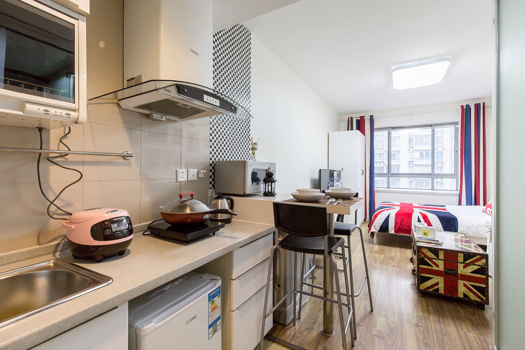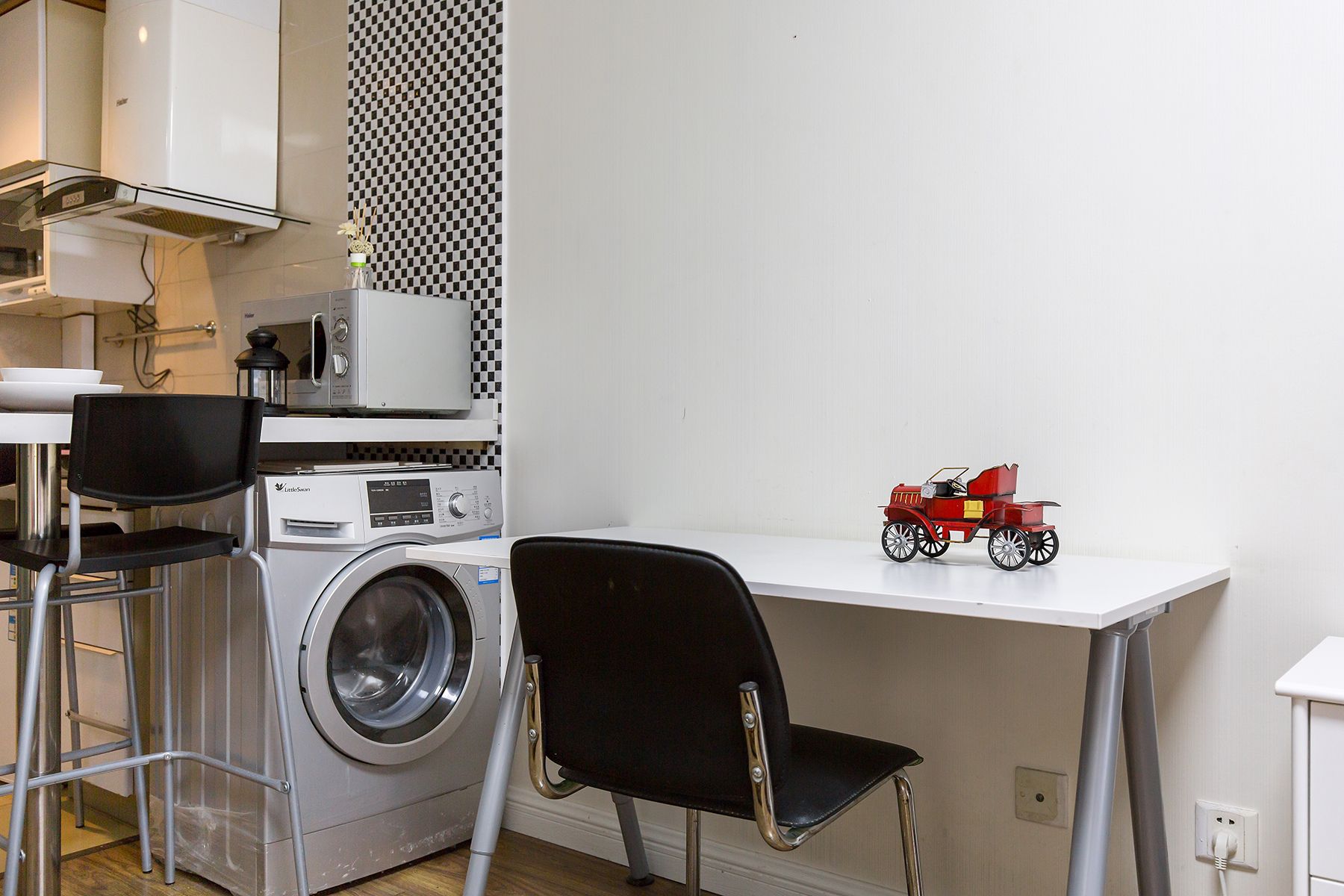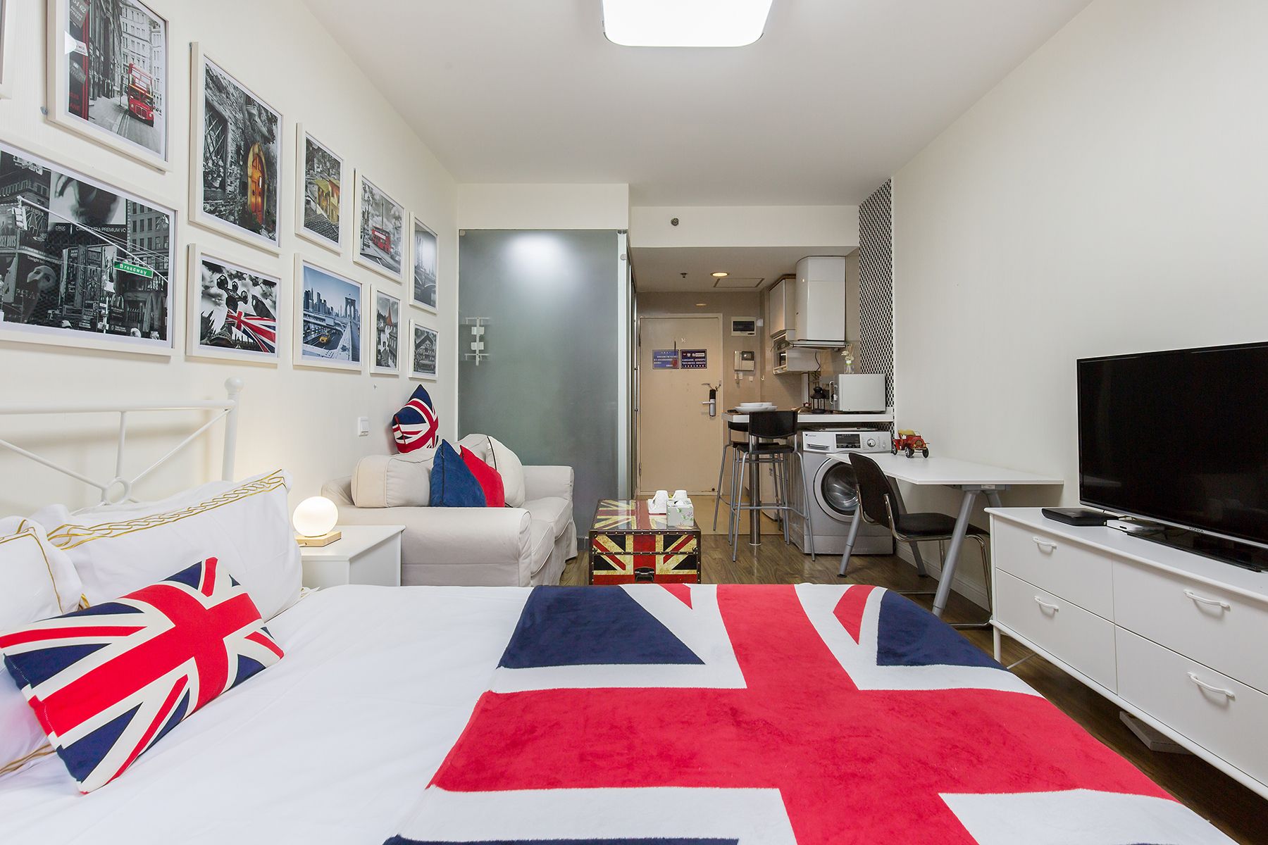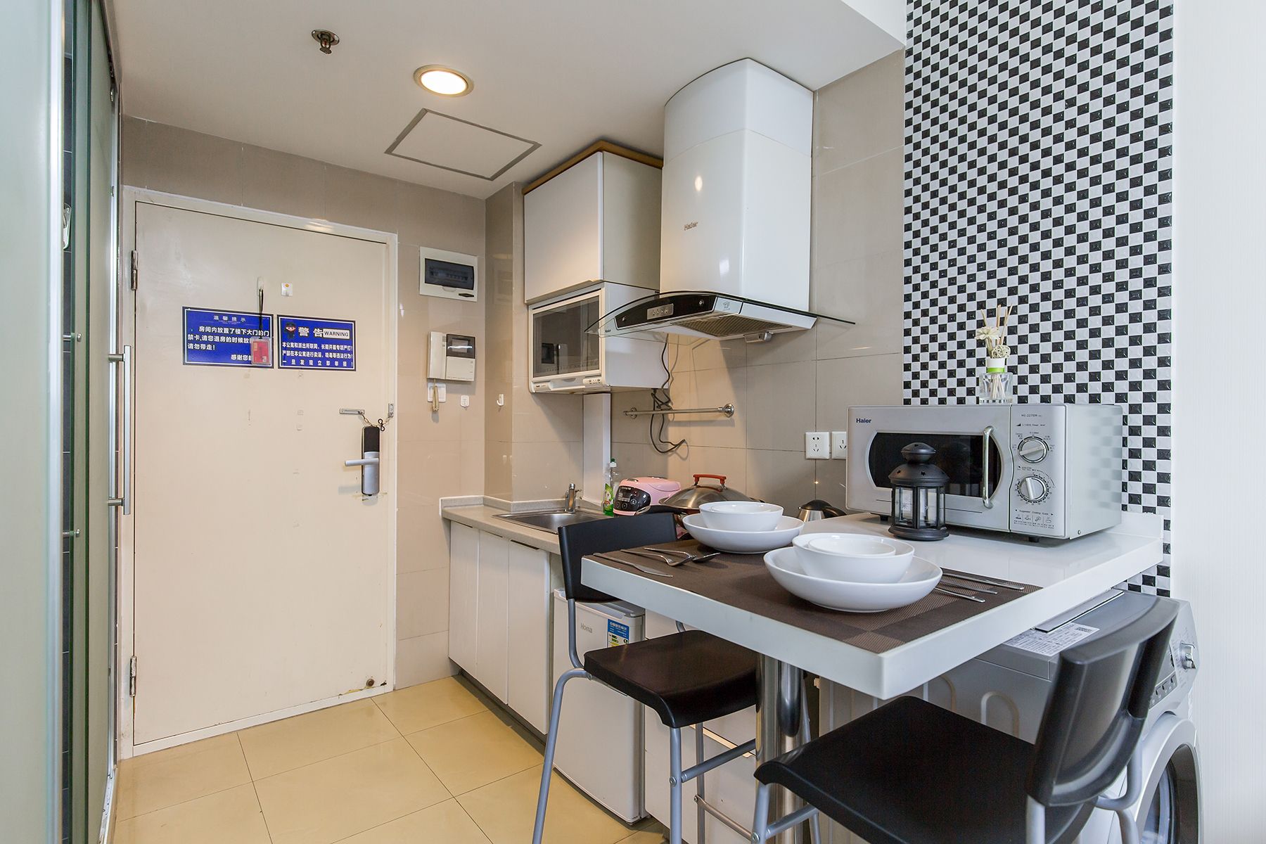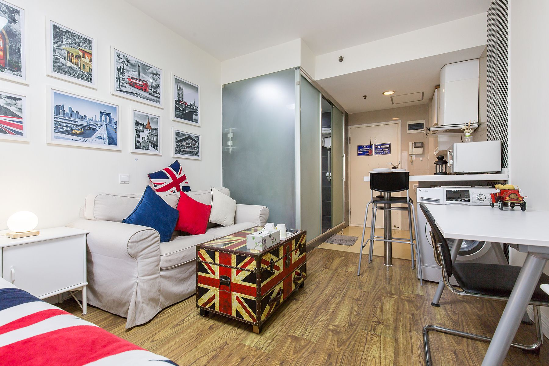 整个房间以简约为主题,在释放整个房间的空间感的同时,配备了必要的生活用品,包括一张双人床,一个简易的衣柜,书桌,茶几等,房间是独立的卫生间。当然还包括一个多功能厨房,可以在其中制作简单的午餐或者早餐。屋内还配置了洗衣机以及晾衣杆,能够满足您基本的生活所需,不论您是商务出差,还是在这附近生活,都非常便利。该房间非常适合独自一人,年轻的情侣居住。