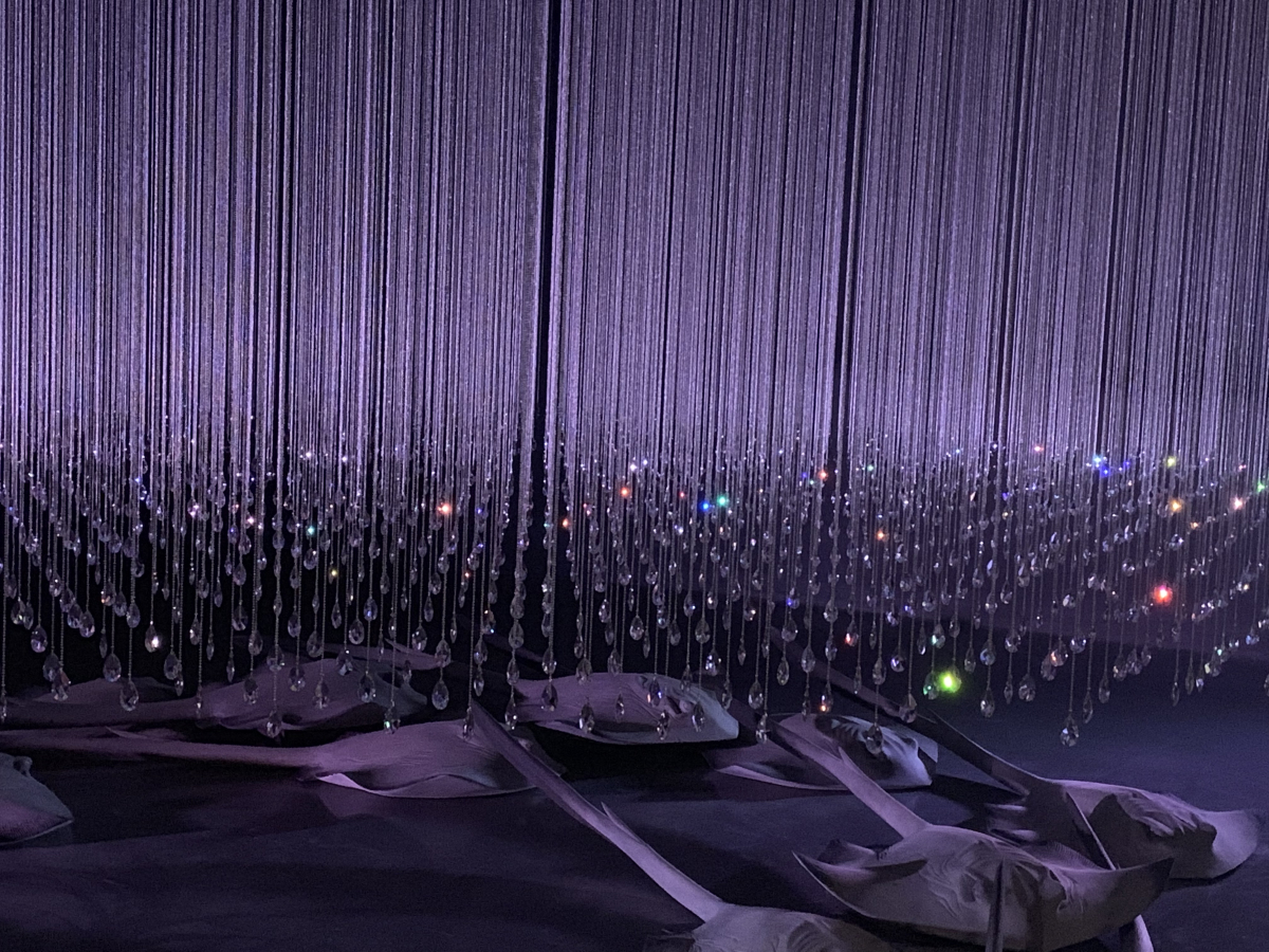 上图是一个典型的装置艺术。艺术家缅怀自己的父亲,父亲在海边自杀了。这些画面一直都是萦绕在艺术家的脑海中,一根根细丝下面缀着玻璃钻石象征着雨天,下面放置了很多鱼的模型,应该是表明海边的情景。加上光和声音,如果在现场,会更好的感受艺术家要表达的东西。