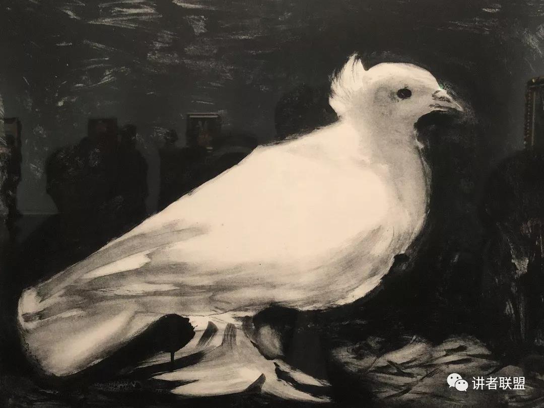 西班牙艺术家毕加索一生喜爱鸽子,他创作过许多以鸽子为主题的画作,象征着纯洁,也是美好的寄托与希望。这幅作品是1949年在巴黎举办的世界和平大会的海报的原画。印刷了50幅。1950年于华沙召开第二届世界和平大会时,毕加索又创作了结着橄榄枝飞翔的白鸽,被智利诗人聂鲁达称为“和平鸽”,自此毕加索的鸽子作为和平的象征飞到了全世界。这幅石版画是将墨水创造出的淡彩美丽效果发挥到极致的杰作,仅用黑白两色表现出细腻而丰富的效果,笔触如同柔软的羽毛一般温暖。从艺术表达的角度来看,在毕加索那大量极具冲击性和实验性的画作中,这是一幅温暖而寄托着美好情怀的小品,反映出艺术家柔软而纯真的一面。从其用途和目的来看,是艺术家介入政治的有力证明。